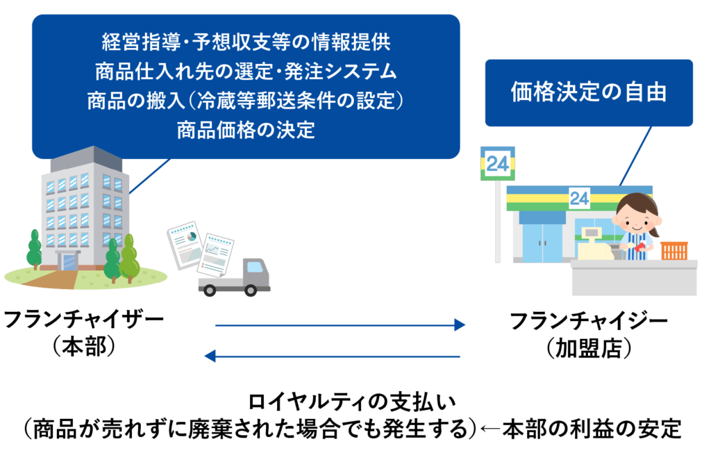 フランチャイザー(本部)とフランチャイジー(加盟者)からなるフランチャイズ·システムは、コンビニエンスストアや飲食店を中心に普及しています。