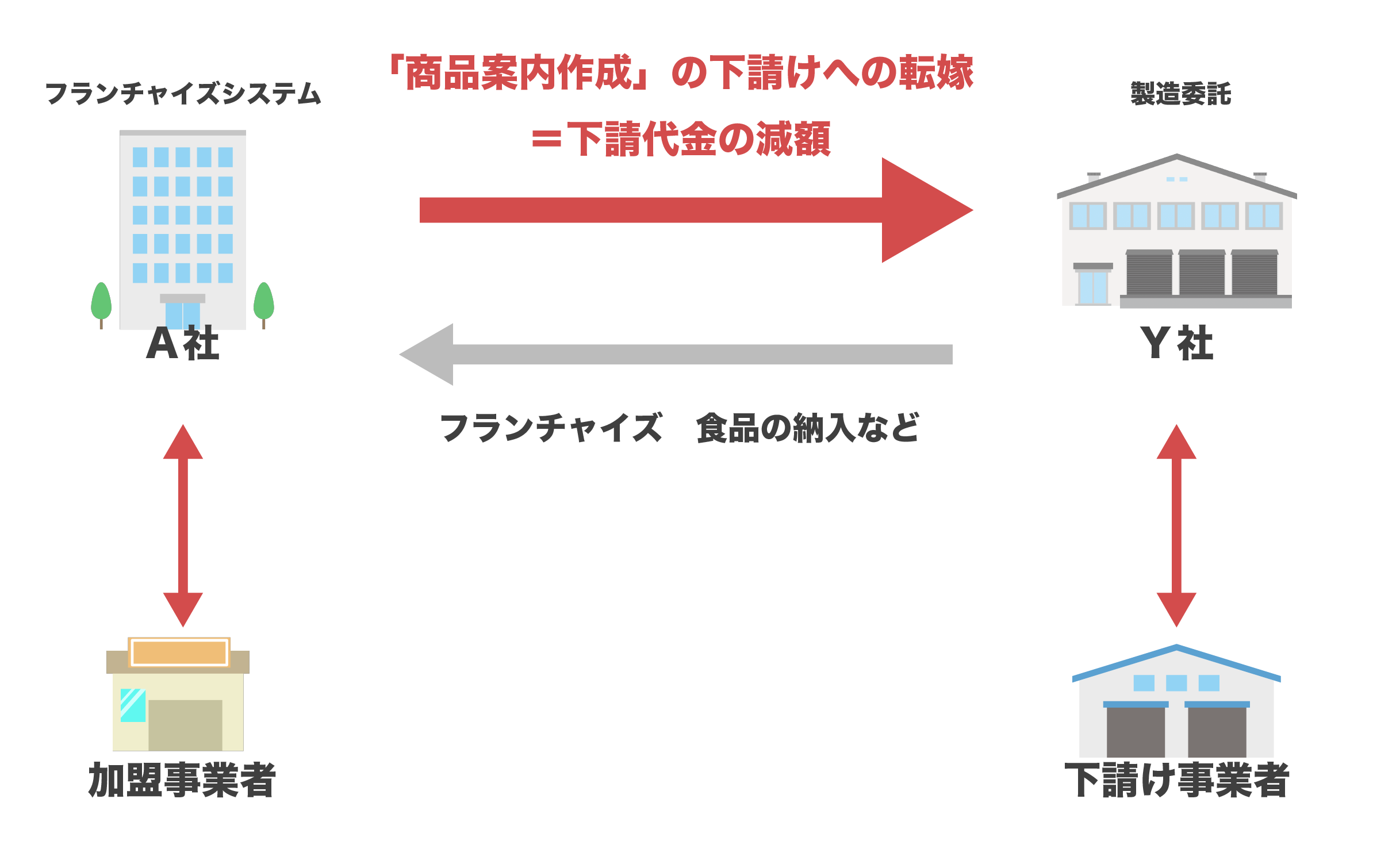 Y社は、A社フランチャイズに加盟する店舗に配信する「商品案内」を作成する費用として「商品案内作成代」を請求されており、その全額を「写真代」と称して、下請代金から差し引くことにより、下請事業者の責めに帰すべき理由がないのに、下請代金の額を減じていた。